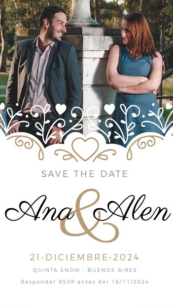La Invitación Web es un sitio online con el mismo fin que una invitación tradicional en papel, pero con funciones ampliadas, donde el invitado podrá confirmar su asistencia online con un clic, agendar la fecha, ver las indicaciones en Maps y mucho más. Por otro lado, el Save The Date, es un adelanto para anunciar a los invitados el evento, para que vayan agendando la fecha, previo a la invitación formal. También se puede usar para recordar a los invitados la fecha unos días previos al evento y con nuestra opción Save The Date Web, podés tener un Save The Date interactivo.